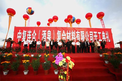 在欢庆的锣鼓、军乐、礼花、鞭炮声中,参加仪式的嘉宾们为中复连众(酒泉)复合材料有限公司叶片项目开工培土奠基。