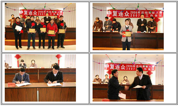 2007年元月31日下午,中复连众2006年总结表彰大会暨2007年工作会议在集团公司办公大楼五楼多功能厅召开,公司全体员工参加了会议。会上,乔光辉总经理总结了2006年工作,布置了2007年工作任务,陈立友主席宣读了关于《表彰2006年度先进个人、标兵、先进集体的决定》,由集团公司领导颁发了奖金、奖牌。为了做好07年的工作,乔光辉总经理同各子分公司、事业部签订2007年经营责任书。最后,中复集团公司副总经理、胜游党委书记、董事长任总作了重要讲话,由耿婷芳副总经理作会议总结。图为公司领导与各事业部主要负责人签订2007年经营责任书与公司领导为标兵等颁奖的照片。