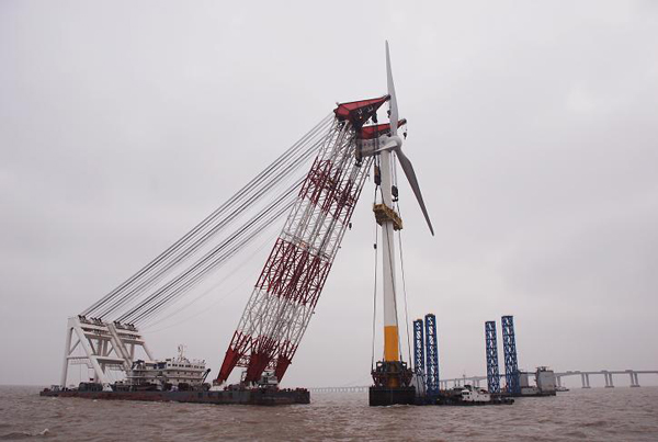 2010年2月27日15时28分,随着最后一台风机与海上基础承台对接,我国首座、也是亚洲首座大型海上风电场一一东海大桥海上风电场全部34台风机安装取得圆满成功。这标志看我国海上风力发电产业稳稳迈出了第一步并进入了实战阶段。