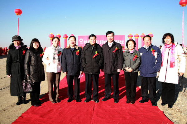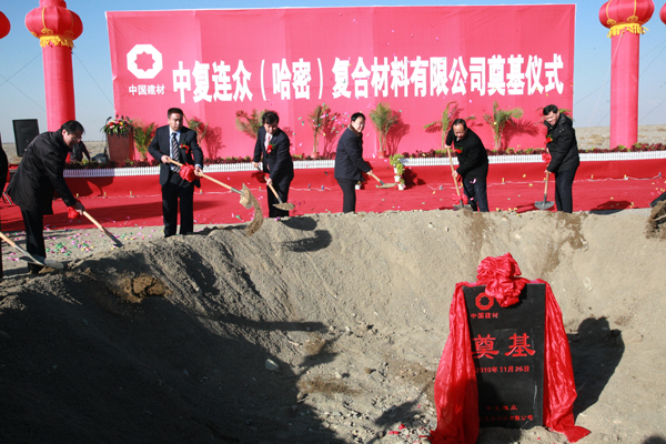 在欢庆的锣鼓、军乐、礼花、鞭炮声中,参加仪式的嘉宾们为中复连众(哈密)复合材料有限公司叶片项目开工培土奠基。