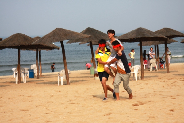 根据比赛规则,所有参赛人员平均分成两队,每队队员在确定好各自的参赛项目后,比赛正式开始。在遇险营救项目中,两队都派出了实力较强的队员,他们从起点出发,蒙着双眼将两名队员从终点抬到起点,在摸索中前进的同时,还要谨防对方队员从中捣乱,以最快的速度返回起点;单腿跳是一项考验队员耐力的项目,每队三名队员依次拉着前一名队员的脚踝,从起点出发,单腿跳到终点,柔软的沙子多次让比赛队员跌倒,队友的掌声激励着他们站起来完成比赛;双方男女队员进行的两人三足比拼,将整场比赛推向了一个沸点;比赛在充满欢声笑语的后退接力跑中结束。