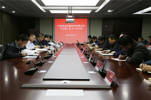 12月21日,中复连众党委召开2018年第五次中心组(扩大)学习会,集中学习了“庆祝改革开放40周年大会精神”“中国建材集团第一次党员代表大会精神”《中纪委关于贯彻落实习近平重要指示精神整治形式主义、官僚主义的工作意见》“国资委‘习近平总书记全国国有企业党的建设工作会议重要讲话发表两周年学习座谈会’精神”“全国国有企业改革座谈会精神”和《中国共产党支部工作条例(试行)》等会议和文件精神。党委书记、总经理乔光辉主持会议并讲话,党委委员、副总经理南洋、梁颖作交流发言,中心组成员及所属党支部书记、中层以上党员干部参加会议。