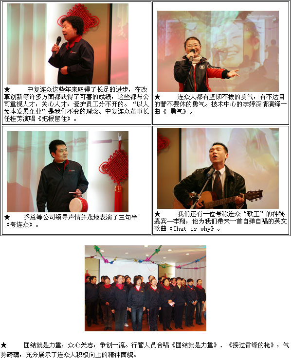 在主持人的优美的开场白后,中复连众2007年元旦联欢会揭开了序幕。联欢会的节目五彩缤纷,惊喜连连,下面分别是这次联欢会的精彩片断: